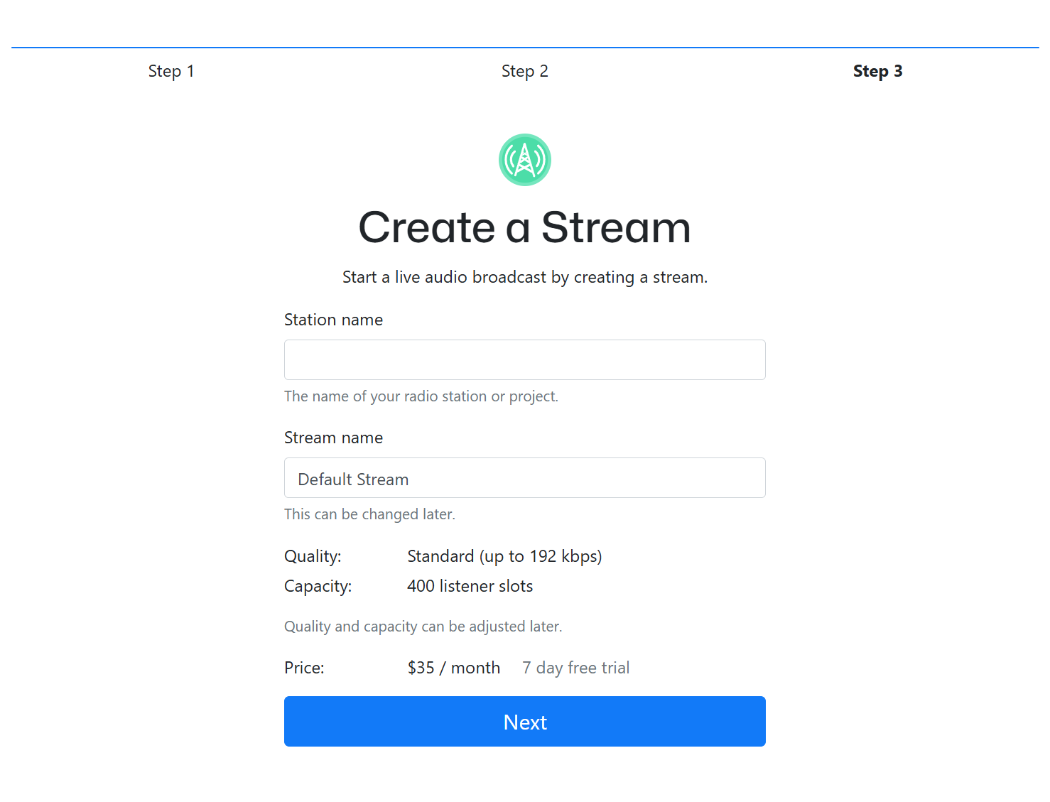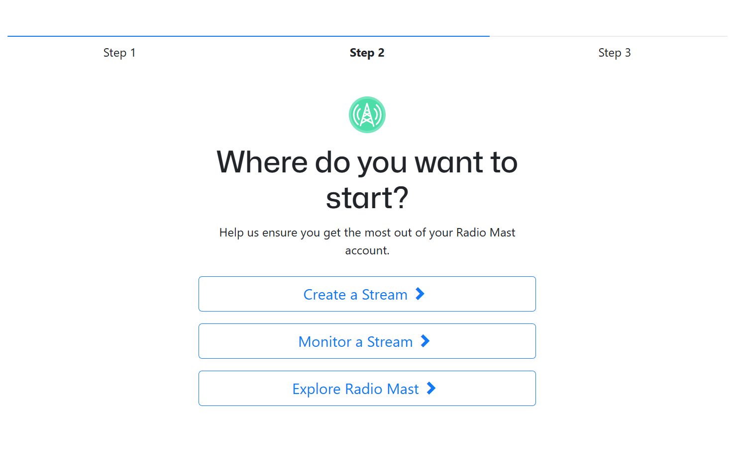 Visit Radio Mast and sign up for a free trial. After you fill out your information and verify your email, you'll reach Step 2 of the signup process.