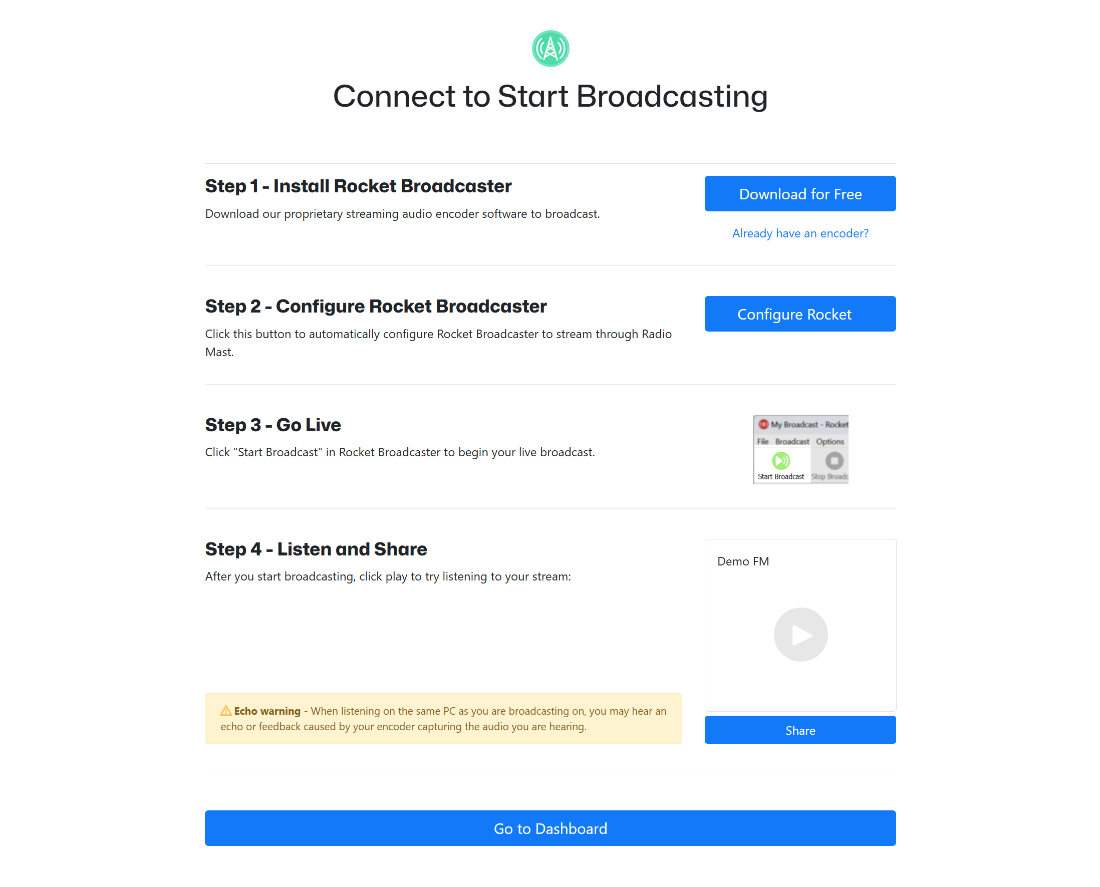 We suggest that you use Rocket Broadcaster, but you can use any Icecast compatible encoder that suits your needs. The advantage of using Rocket Broadcaster is that it provides the best, easiest integration with Radio Mast, and can be controlled remotely. This is especially useful if you aren’t always by your computer when you are broadcasting.